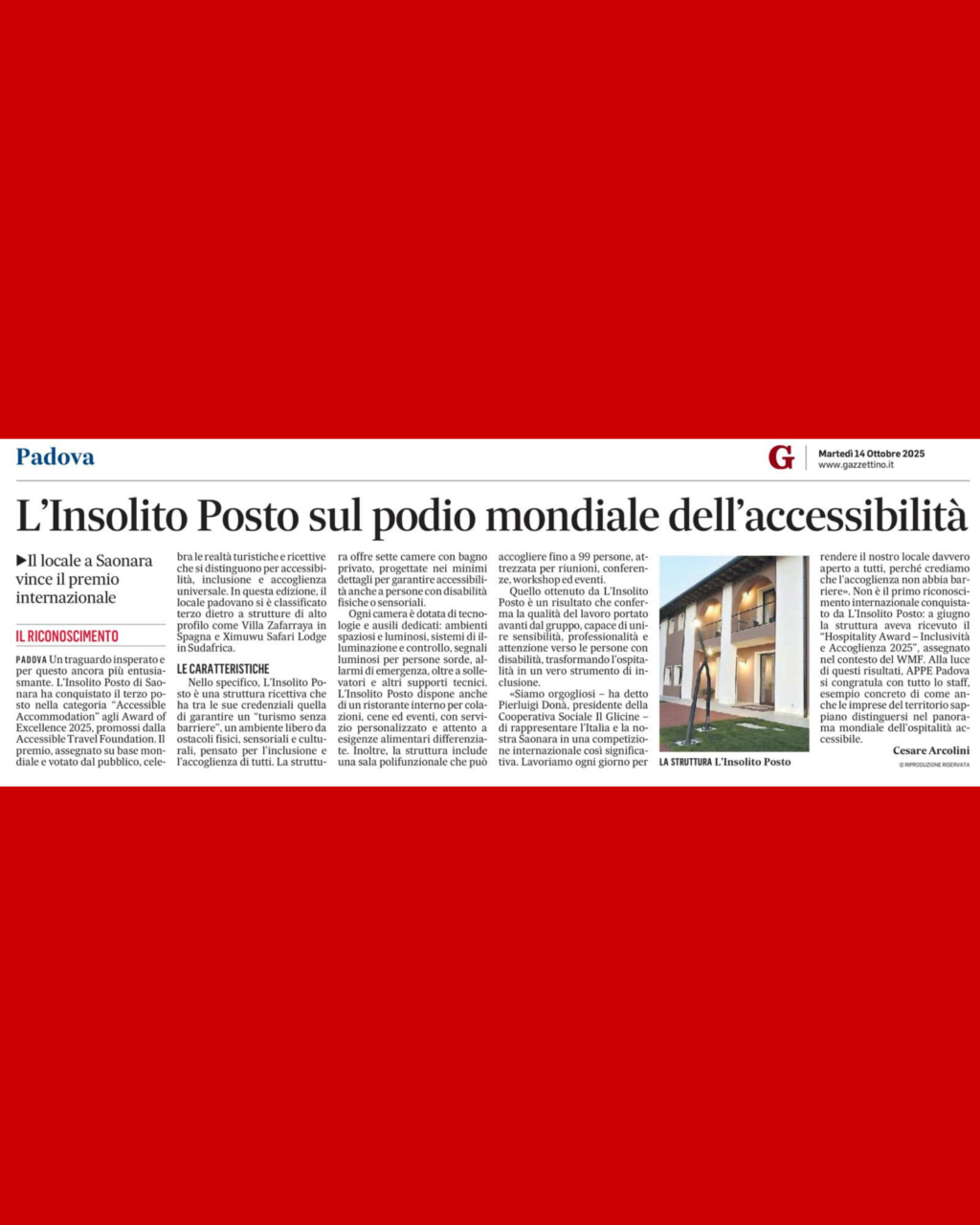 Un altro premio per l’Insolito Posto! Qualche settimana fa la nostra struttura si è aggiudicata un nuovo, importante, riconoscimento. Dopo aver vinto il primo premio all’Hospitality Award-Inclusività e Accoglienza qualche mese fa, ora abbiamo ottenuto un importante terzo posto al prestigioso Awards of Excellence Accesible Accomodation 2025.